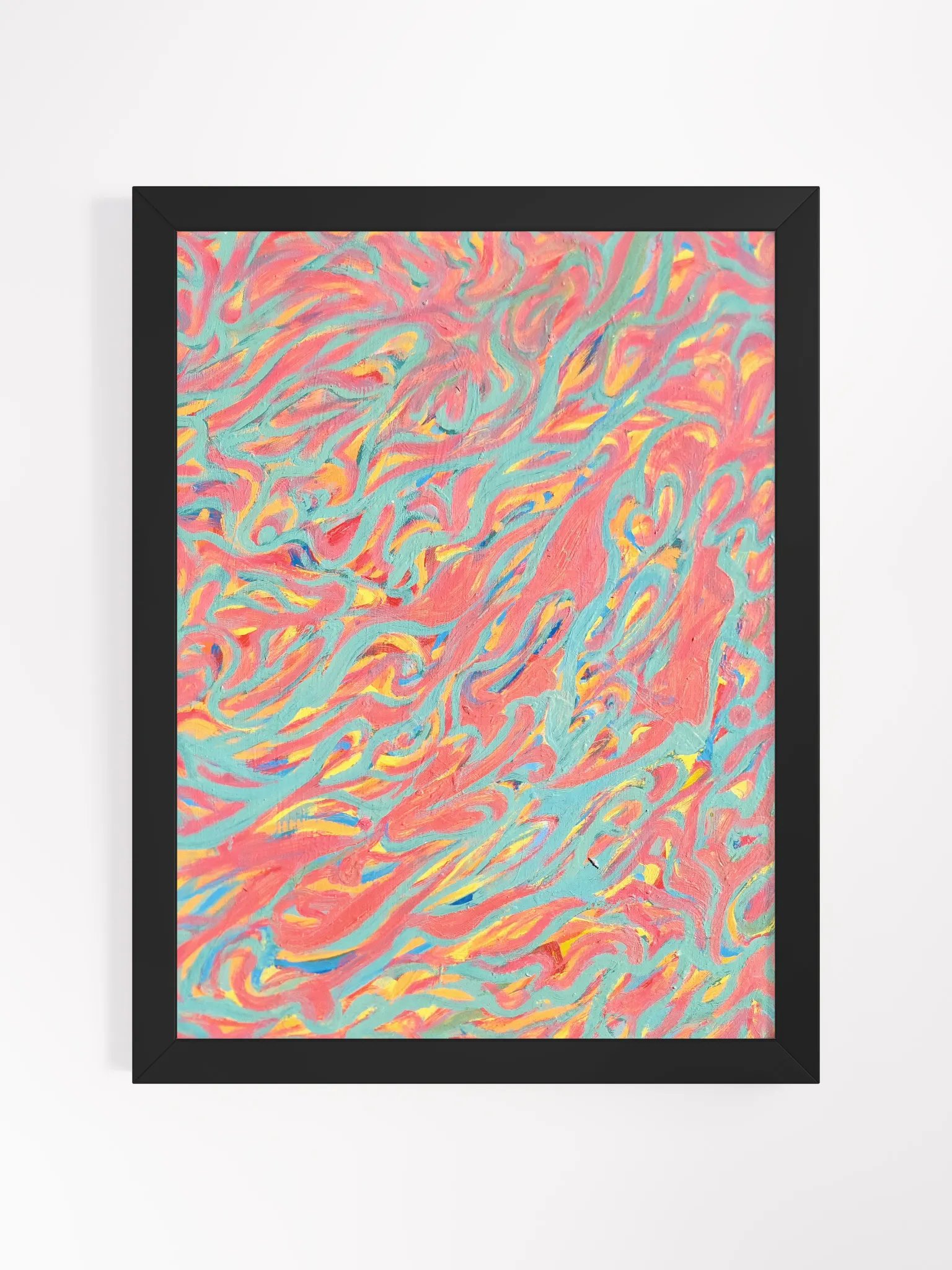 This is a fine art print of an original 18 X 24 inch (45.72 cm X 60.96 cm) oil-on-panel painting that I created on the balcony of a room that I rented in a house I lived at in Jersey City, NJ. I like to call this painting "Physical Graffiti" because it captures the dynamic energy and fluidity of graffiti, while also incorporating subtle hints and allusions to the human form.
